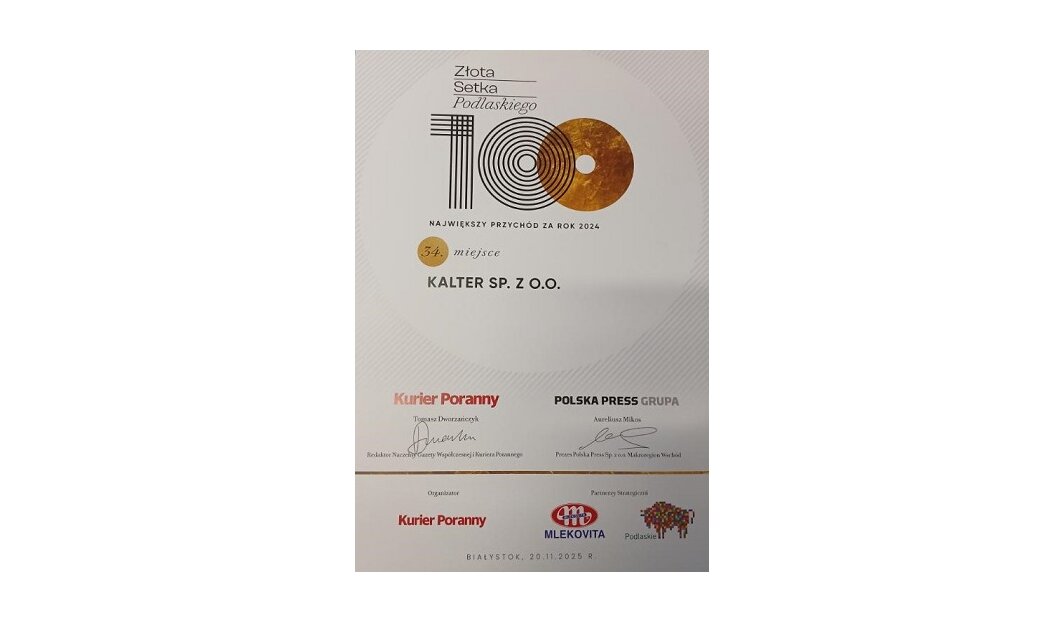 Z przyjemnością ogłaszamy, że Kalter Sp. z o.o. zajęła zaszczytne 34 miejsce w gronie 100 największych firm Podlasia!